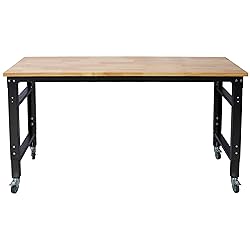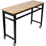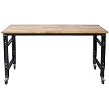 Versatile: This spacious workbench serves multiple purposes, whether used as a portable workstation in your garage, an additional counter space in your kitchen, a computer desk for your home office, or a crafting table for your creative projects. Easy to Move: Featuring customizable feet and locking wheels, this workbench effortlessly rolls around for your shop projects, whether you're working indoors or outdoors. You can also remove the wheels for more stability. Adjustable Height: With 5 different height settings, you can customize the workbench legs to suit various tasks, whether you're carving, sewing, painting, doing woodworking, or working on car repairs. It can accommodate different chairs and ensure ergonomic comfort. Durable and Stable: Our garage workbench boasts an indestructible steel frame and a solid acacia wood surface. The locked caster ensure a stable work surface, making it suitable for various tasks such as gardening, soldering, and more. Premium Material: The 1” thick rubber Wood butcher block surface is not only durable and scratch-resistant but also low maintenance. While assembly is required, the detailed instructions make it an easy and straightforward process. The dimensions are 60”Wx20”Lx34-42”H, providing ample space for your projects.