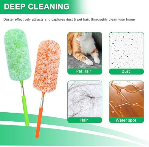 - 【EASY STORE & CLEAN】The Microfiber duster is effortless to maintain.the Microfiber duster head efficiently traps dust, debris, and fine particles through static adsorption.After use, simply rinse the cleaning head under warm water and hang it in a dry, well-ventilated area.It will regain its fluffy texture, ready for next time.