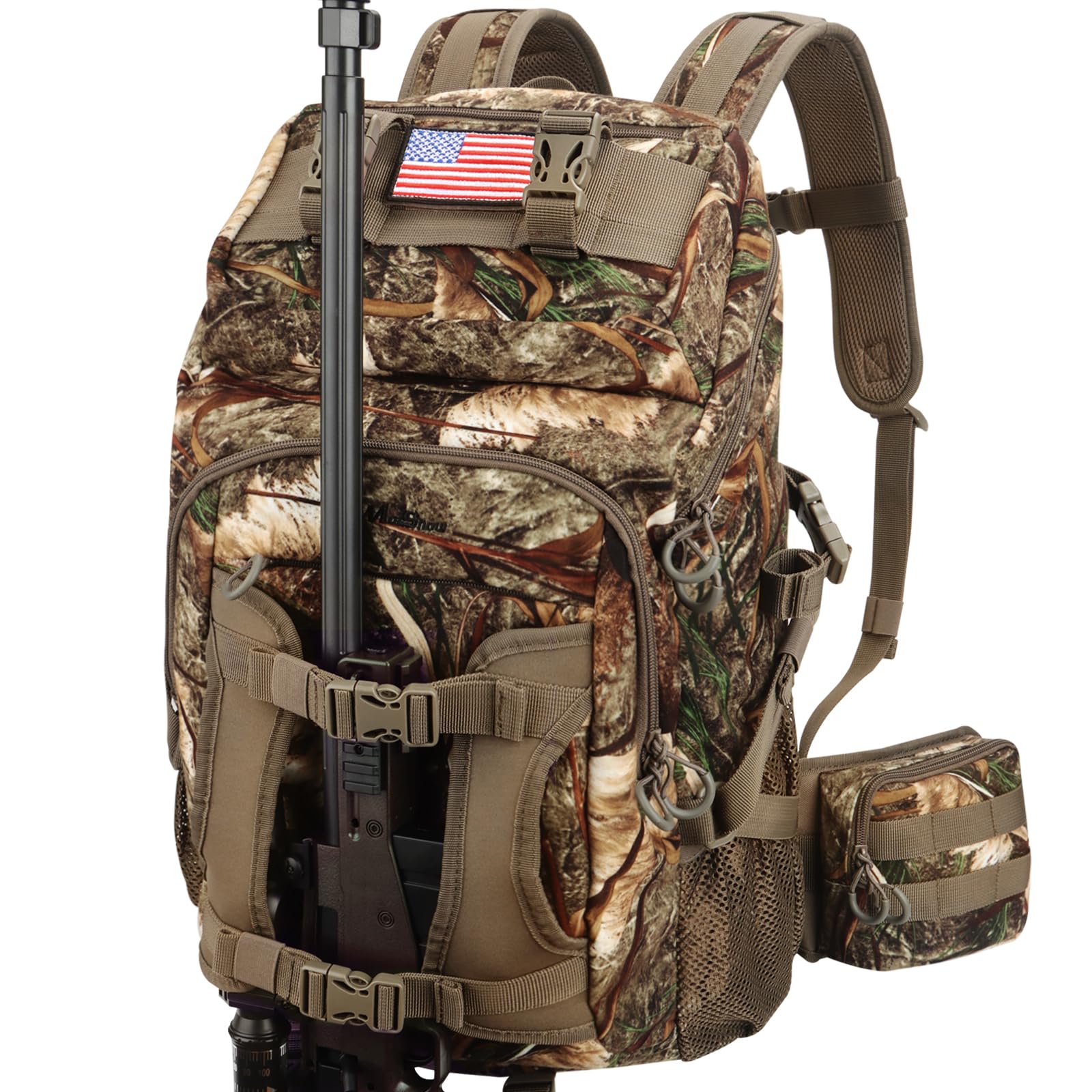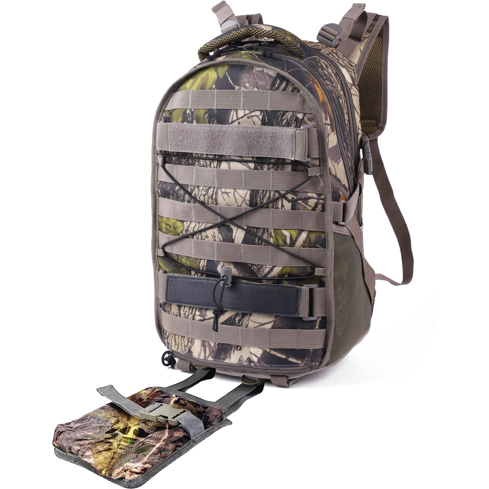 - MOLLE System & Gun Storage: MOLLE system on the front of the hunting pack that allows you to mount a variety of accessories (tools, first-aid kits, etc.) Camo backpack includes a hidden gun scabbard at the bottom and straps for hunting tents/sleeping pads.
