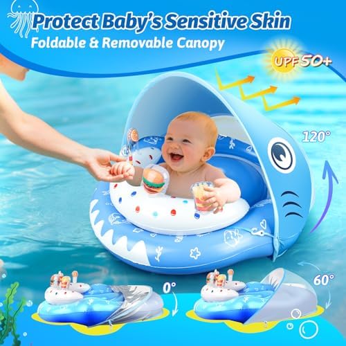 - [Detachable and Adjustable Canopy] Perfect for babies aged 3-36 months, this infant pool float comes with a UPF50+ sun-protective canopy to shield your baby’s delicate skin from the sun. Breathable mesh sides offer clear visibility, allowing easy interaction with your baby while swimming. The adjustable design lets you fully or partially cover the float, ensuring endless water fun.