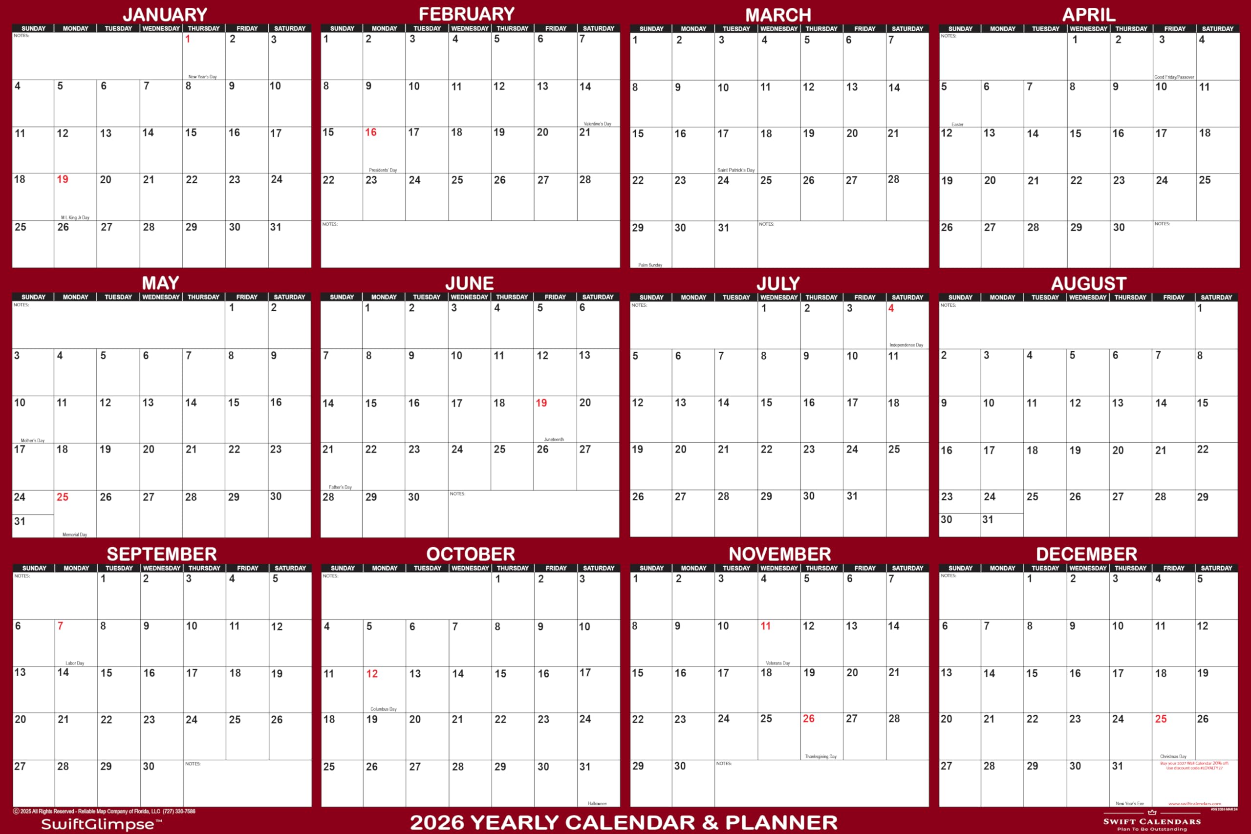 32" x 48" SwiftGlimpse 2026 Wall Calendar Erasable Jumbo XL Wet & Dry Erase Laminated 12 Month Annual Yearly Wall Planner, Reversible, Horizontal/Vertical, Maroon