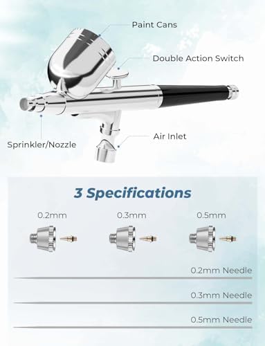- Complete kit: Comes with multiple nozzles(0.2/0.3/0.5mm), cleaning brushes and needles, wrench, dropper, seal rings, air hose, 12v DC adapter, providing everything you need to get started
