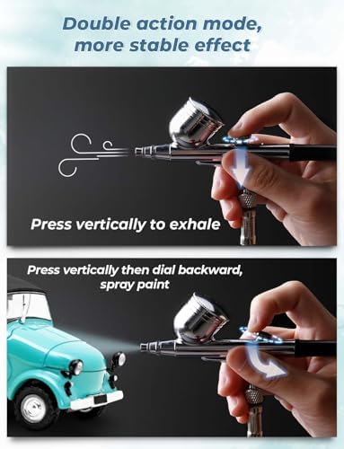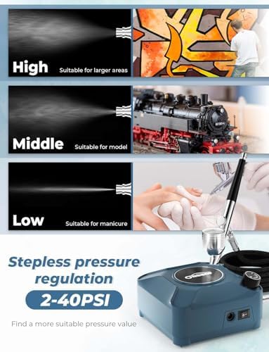 - Adjustable High-Pressure Spray: our airbrush reaching 10.5L airflow that ensures a smooth, consistent flow, with a stepless pressure adjustment knob (from 2 to 40PSI) for fine-tuning airflow to meet different spraying work