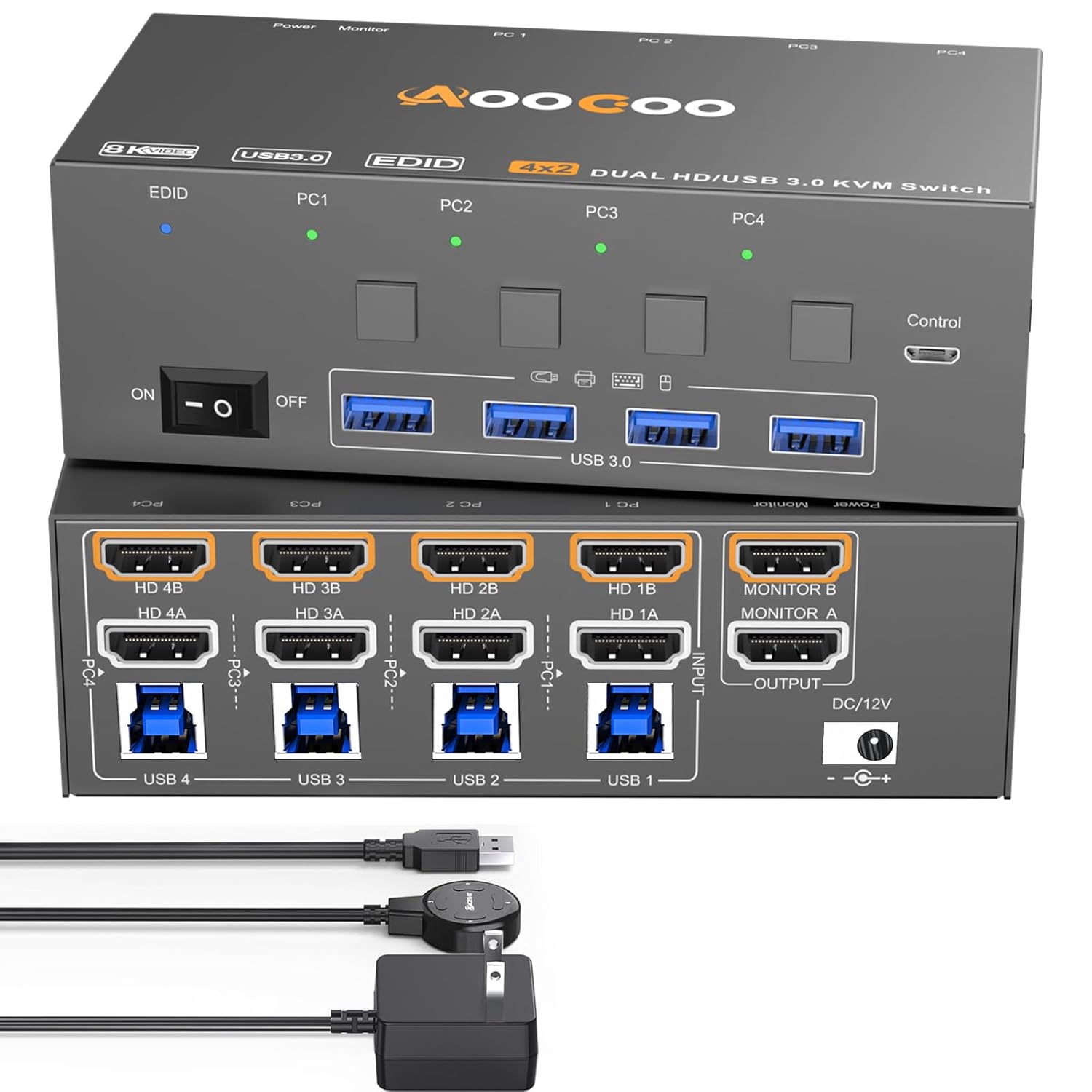 - 【Dual Monitor KVM Switch 4 PC】KVM Switch HDMI 4 Ports allows you to switch between 4 computer and share 2 monitors. Use 1 set of keyboard and mouse to control 4 computers and 2 monitor without having to buy additional monitors, keyboards and mouse.