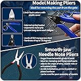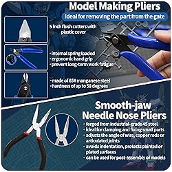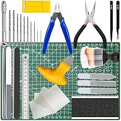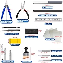 [Full Range & Cost Efficient] The hobby model toolkit contains 1pc 5 inch flush cutters with plastic protective cover, 1pc smooth-jaw needle nose pliers, 2pcs precision tweezers, 4pcs sandpapers (#600, #800, #1000, #1200), 1pc model separator, 1pc 3 in 1 sanding stick, 1pc 100/180 grit black sanding stick, 1pc A4 self-healing cutting mat, 1pc steel ruler, 1pc model parts opener, 1pc 4-ways buffer block, 3pcs model glass polishing files, 1pc cleaning brush, 1pc pin vise hand drill with 10pcs 0.8-3.0mm micro twist drill bits. [Durable Material] The pin vise hand drill comes with an adjustable 3-jaw hardened steel keyless chuck, securely grips even the smallest bits. The flush cutters have high frequency cutting edge, industrial-grade manufacturing standard, fine workmanship. The smooth-jaw needle nose pliers are designed with limiting lever, preventing the opening from being too large. The A4 self-healing cutting mat features a thickened anti-cut white inter layer, which ensures that the mat recovers from cuts and scratches. [ Multipurpose Application] The 5 inch sprue cutters are designed for cutting plastic sprues, which are comfortable for long hours of operation. Smooth-jaw needle nose pliers can be used for post-assembly of models, clamping and fixing small parts, avoids indentation, protects painted or plated surfaces. The model separator can disassemble the assembled parts and can be used as a sander. The glass flies are easy to deal with the designed for different parts of the shape of the close to the parting line for both wet and dry purposes, [Practical Model Tool Kit] The model building tool kit is suitable for a beginner, hobbyist and advanced modeler. Perfect for Gundam model building, & repairing, 3D printing production, art production, handicraft carving, template cutting, and customizing car models and other hobby projects, making it a versatile addition to any modeler's arsenal. [Nice Gift] The plastic model making kit is nice gift for your friends and family numbers who are model craft beginners or amateurs to help them create various delicate crafts like miniatures, cartoon, figurines and and other craft model.