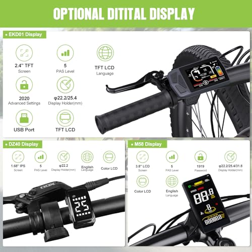 - [4 Riding Modes for Total Control]:Switch seamlessly between E-bike, Pedal Assist, Walk Assit , or Traditional Cycling mode to match your energy, terrain, or fitness goals. Preserve knee health on steep climbs, save time with electric throttle, or enjoy exercise—all while the LCD display tracks speed, mileage, battery life, and time. Upgrade to the EKD01 Blue*tooth display for navigation and ride analytics