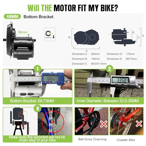 - [All-Weather Durability & Universal Compatibility]:Built for year-round adventures, this IPX5 waterproof mid drive electric bike kit thrives in rain, snow (-20°C to 45°C), and daily weather. Compatible with road bikes, mountain bikes, hybrids, or even tricycles (68-73mm BB width), it’s perfect for commuters, seniors, or delivery riders seeking reliability. Includes pre-installed cables, detailed guides, and plug-and-play components—no expertise needed to revive your old bike!