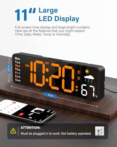 - 【Large LED Display】The 11" corded wall clock features full-screen time display and large bright numbers, easy to read. Here are all the features that you might expect for a digital wall clock: Time, Date, Week, Temp or Humidity. ATTENTION: Must be plugged in to work. Not battery operated.