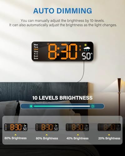 - 【Auto Dimming】You can manually adjust the brightness by 10-levels. The digital wall clock has an auto dimming function; When turned on, the brightness will auto decrease at night, not to disturb your sleep.