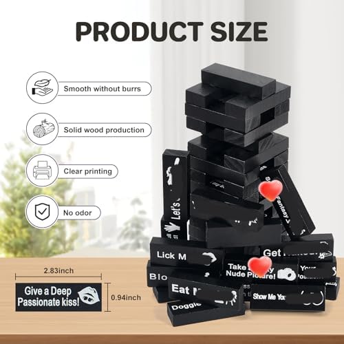 - 【48 Black Blocks for Unforgettable Nights】-- Our premium adult game for couples includes 48 dark wood blocks, each laser-engraved with fun, flirtatious, or daring challenges designed to spark laughter and connection. Whether you're planning a spicy date night or hosting a game, this tower brings heat and humor to any adult gathering.