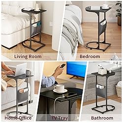 【C-Shaped End Table –Everyday Convenience Upgrade】This small side table features a C-shaped design that easily slides under couches, sofas, recliners, and beds, keeping your remotes, food, drinks, tablets, and daily essentials close by while saving valuable floor space. Standing 24.6" high, it fits most couches perfectly for comfortable use. The lightweight, flexible design makes it easy to move, making it ideal for small living rooms, bedrooms, dorms, and apartments 【Everything Right Beside You, Supported by a Durable Wooden Top】Enjoy daily convenience on a thick, eco-friendly wood tabletop designed for real life. The modern U-shaped surface safely holds phones, coffee, snacks, laptops, and devices while resisting scratches, water, and spills for easy, stress-free cleaning 【Strong, Wobble-Free Design for Everyday Use】Built with a quality metal frame and a durable tabletop, the C-shaped side table delivers reliable stability for daily use. Reinforced triangular bracing adds extra strength, supporting up to 22 lbs while confidently holding laptops, meal trays and drinks securely without wobbling. Adjustable feet help keep the table stable on uneven floors 【Power Within Reach – Side Table with Built-In Charging Station】Featuring 2 AC outlets, 2 USB ports and a 4.9 ft power cord, this C table keeps your devices powered right beside you. Charge your phones, e-readers, or laptops at the same time while relaxing—no need to get up or bend down to reach for distant wall outlets. Tip: Available in Classic or Charging Station versions to fit your needs 【Extra Storage Bag – No More Lost Remotes】The attached large fabric pocket neatly stores remotes, magazines, books, chargers, glasses and daily essentials. Everything stays visible, easy to grab, and off the tabletop—making your space feel cleaner and more organized 【15-Min Easy Assembly & Multi-Use Design】All accessories and tools are included with clear, step-by-step instructions for a smooth setup experience. Designed for everyday versatility, this small side table works as a couch end table, recliner table, laptop desk, TV dinner tray, snack table or bedside table. Its clean, modern look blends seamlessly with your home decor, adding both practical function and style to any space