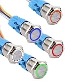 DMWD 5pcs 16mm Metal Latching Push Button Switch Silver Shell 5/8" Mounting Hole, 12V-24V ON Off 5Pins 1NO 1NC with Pigtail Halo Ring LED Light 5 Colors (Blue,Green,Red,White,Yellow)