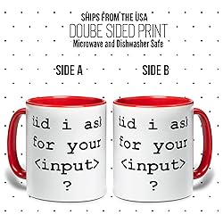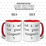 - Start your day with a dose of humor with our "Did I Ask For Your Input?" mug. Perfect for programmers and tech enthusiasts, this ceramic mug features a witty statement that will surely bring a smile to your face every morning. It's a great gift for friends, family, or co-workers who love a good laugh. Ideal for coffee, tea, or any of your favorite beverages. Dishwasher and microwave safe."GIVE THE GIFT OF A SMILE EVERY TIME The best gifts are both memorable and practical - qualities that make this accent coffee mug a perfect choice. Thoughtfully designed and crafted in the USA, this ceramic mug is safe for both microwave and dishwasher use, making it as convenient as it is fun. Each mug features a bold, full-color sublimation design on both sides, ensuring that your design remains vibrant even with daily use as your design won't fade over time! With a sturdy C-handle for easy grip and a range of accent colors on the handle and inside, this mug delivers a premium look and feel thatâ€s perfect for both home and office settings.GRAB YOUR UNIQUE ACCENT MUG TODAY AND START SIPPING IN STYLE!"