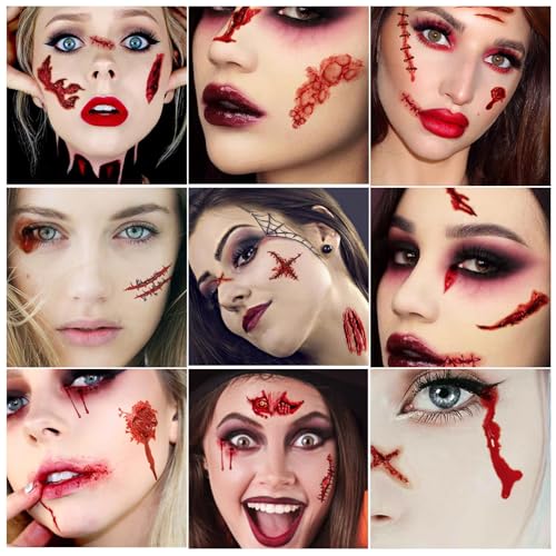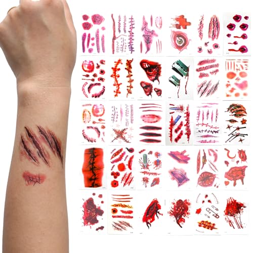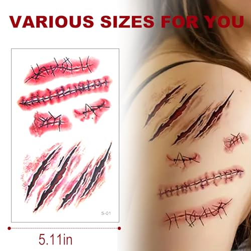 - 【Halloween Zombie Temporary Tattoos】 10 Sheets horror bloody wound stitch tattoos seem very true and natural。 Size: 3.93" x 2.35".