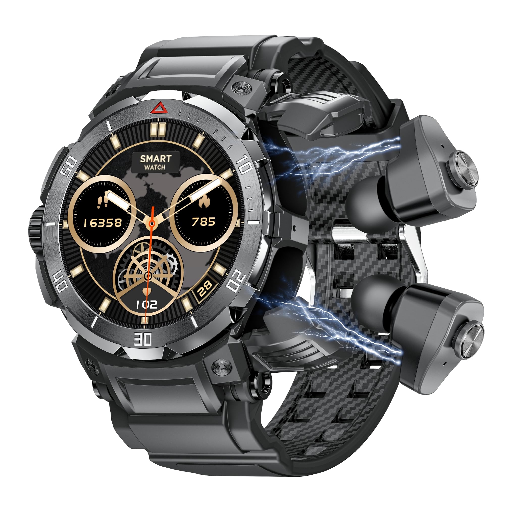 - 【2- in-1 smartwatch】Men's electronic watch with earplugs. You can answer and make calls directly with the built-in earplugs, or wear earplugs to listen to music. The smartwatch has an earplug storage compartment to protect the earplugs from falling and charge them in time. Compatible with Android 5.0+ and iOS 9.0+ phones, which can connect to smartwatches and earphones at the same time.