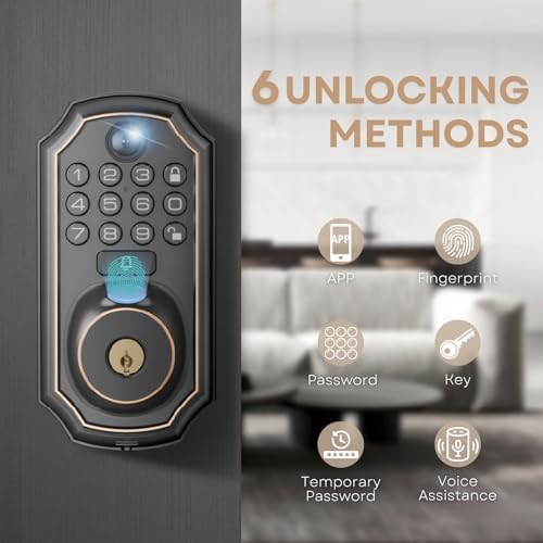 - 6 Unlocking Methods: This smart door lock supports remote WiFi control through the Tuya App, offering six versatile unlocking methods: App control, fingerprint recognition, keypad PIN, traditional key, temporary passcode, and voice assistant (Alexa/Google Assistant), catering to your needs in various scenarios.