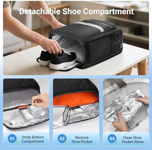 - Detachable Shoe Compartment & Person Item Size: Size: 17*12*7 inches. Travel laptop backpack equipped with a detachable shoe compartment that helps separate footwear from clean clothes or tech gear. When not in use, simply remove the pocket to increase the interior capacity by nearly 1/3—ideal for packing extra clothes. Travel carry on backpack flight approved meets the carry-on requirements of most major airlines and can be stowed as a personal item in the overhead compartment or under the seat