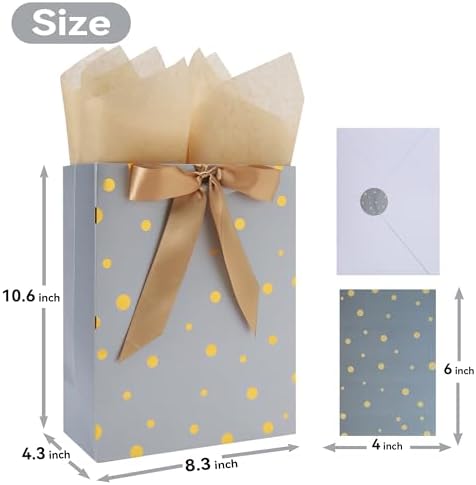 UNIQUE DESIGN: These elegant gift bags showcase a minimalist yet luxurious aesthetic, offering four distinct background designs delicately adorned with shimmering gold polka dots. ULTIMATE SET FOR EASY GIFT GIVING: You will receive 4 Medium gift bags with 4 ribbons, accompanied by 8 sheets of gold tissue paper for effortless wrapping or decoration. Additionally, you'll find 4 greeting cards of the same design, complete with 1 accompanying envelope, providing the perfect canvas for you to express your heartfelt wishes. The included 8 stickers add a sense of ceremony to your gift-giving experience. VERSATILE USE: Those eye-catching gift bags are guaranteed to delight men boys girls and women, making them perfect for celebrating birthdays, Valentine's Day, weddings, anniversaries, Mother's Day, and other special occasions. PERFECT SIZE FOR SMALL & BIG GIFTS: The Sophisticated large gift bag, measuring 8.3”L x 10.6”H x 4.3”D, is the ideal size for accommodating a variety of items. It can hold electronic devices, home decor items, high-quality chocolates, gourmet gift baskets, stylish clothing, designer handbags, fashionable accessories, thought-provoking books, bestselling novels, and much more. ECO FRIENDLY AND HIGH-QUALITY: Expertly crafted from premium paper materials, these eco-friendly gift bags are not only stylish but also sustainable. Designed to support up to 10 pounds, they are made with paper sourced from responsibly managed forests, ensuring their environmental friendliness.