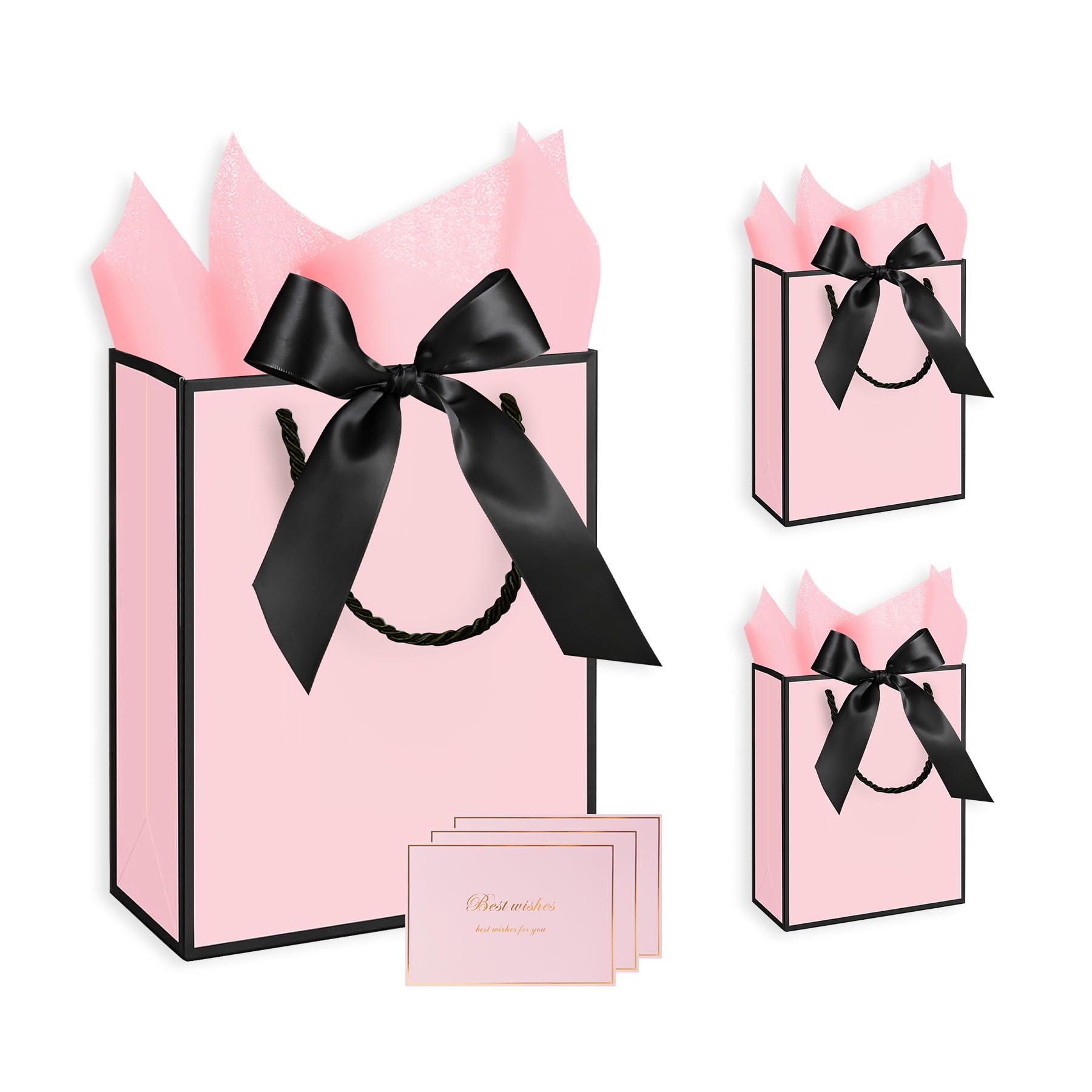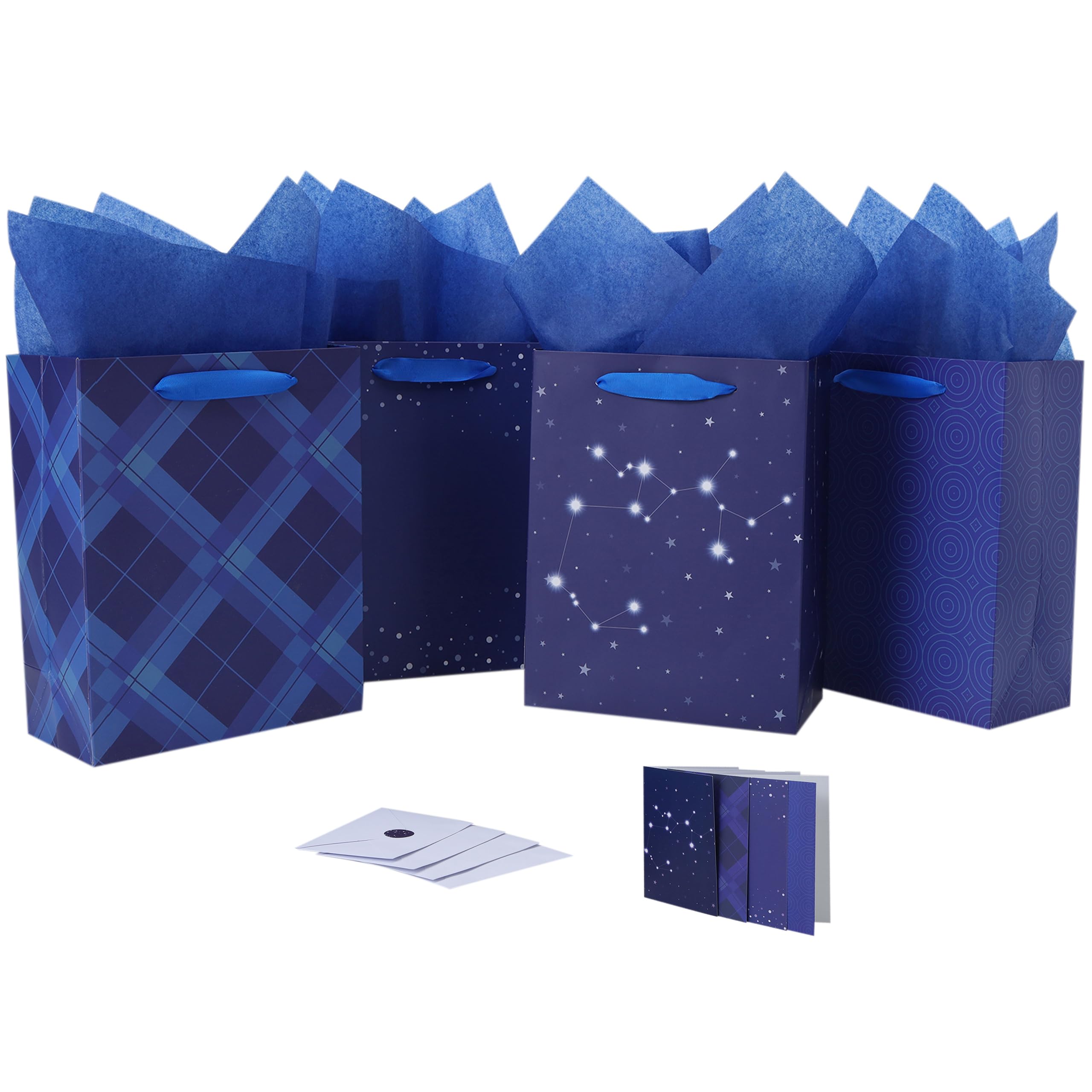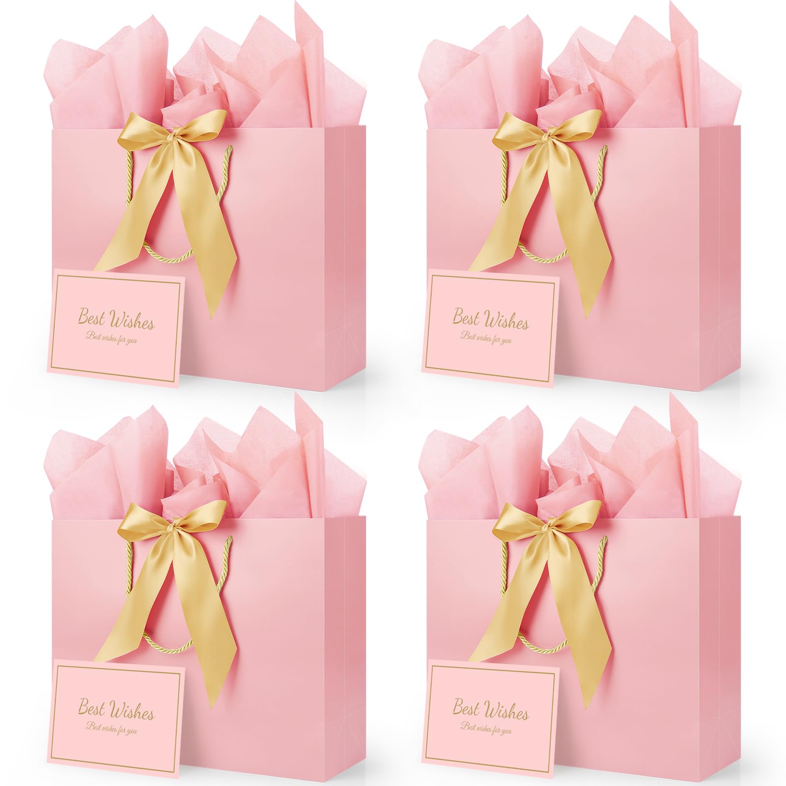 - ULTIMATE SET FOR EASY GIFT GIVING: You will receive 4 Medium gift bags with 4 ribbons, accompanied by 8 sheets of gold tissue paper for effortless wrapping or decoration. Additionally, you'll find 4 greeting cards of the same design, complete with 1 accompanying envelope, providing the perfect canvas for you to express your heartfelt wishes. The included 8 stickers add a sense of ceremony to your gift-giving experience.