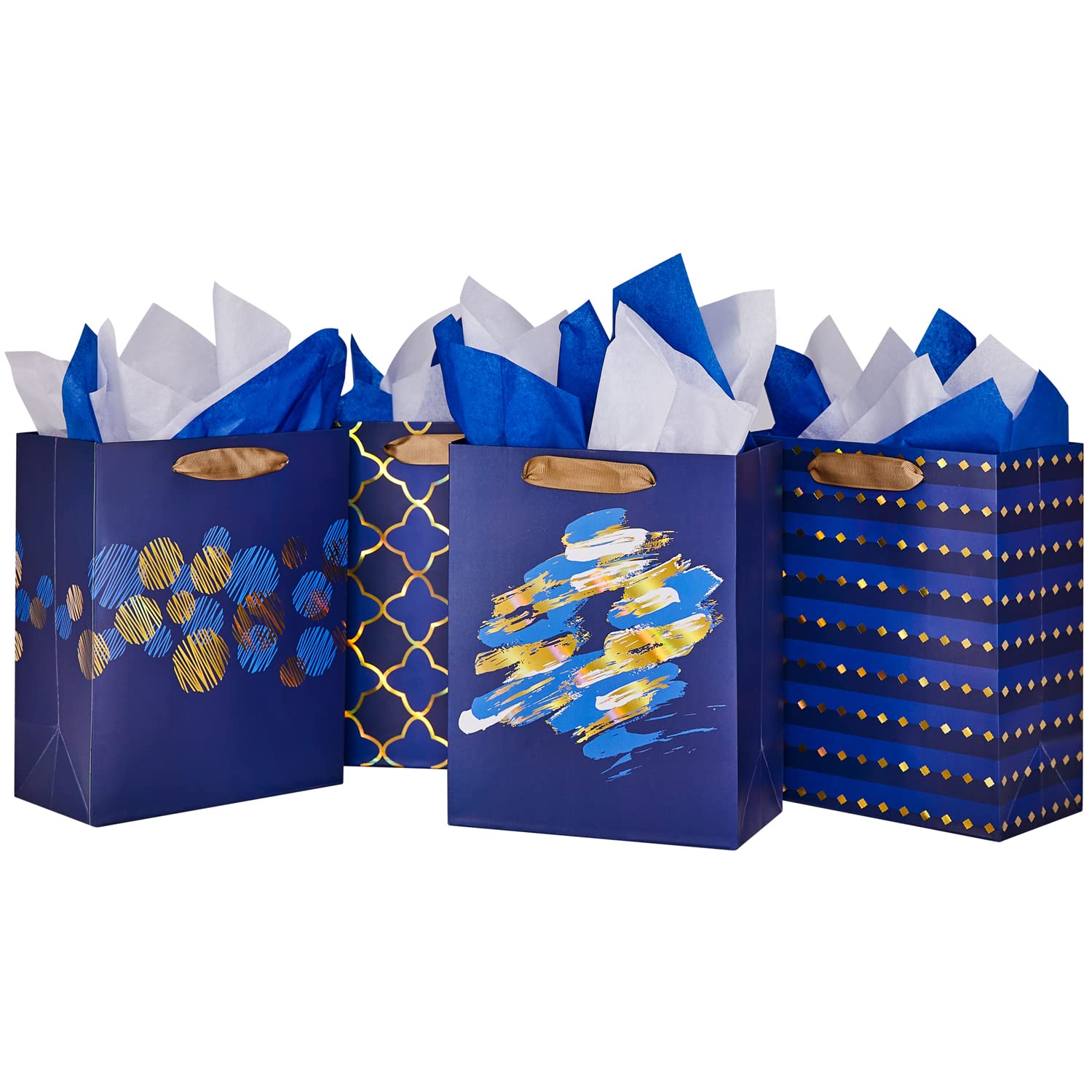 4-Pack 10.6” Medium Gift Bag Set with Handles, Greeting Card, Tissue Papers and Stickers for for Women Girls Men Boys Kids Teens for Birthday Party, Shopping, Wedding, Mother’s Day, Gold Foil Dots design, 4 Pcs