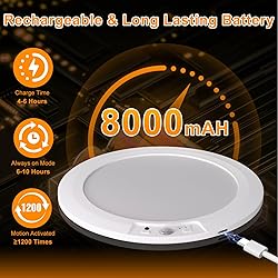 Magnetic & Wireless Installation: This wireless ceiling light requires no wiring or drilling, easy to install. Our battery operated ceiling light built-in magnets/ metal plates/double-sided adhesive tape, it's easy to install on wall/ceiling and remove for charging. Package includes 2 usb rechargeable ceiling lights, 2 usb cables, 4 metal plates with double sided tape, and instruction manual 8000mAh Capacity Battery & USB Rechargeable: Built-in 8000mAh high capacity battery, can be fully charged by usb-type c cable in 4-6 hours, no need to buy extra batteries. The rechargeable ceiling light can last 8-10 hours in stay on mode and 35-50 days in motion sensor mode once fully charged 5 Color Temperatures & 10 Level Brightness Dimmable: Seamlessly switch the motion sensor closet light between warm light to cool light (2700K/3000K/4000K/5000K/6500K) via push button or remote control. Smooth brightness dimming (10%-100%) allows you to customize light intensity from soft ambient glow to full brightness for all kinds of ambient lighting needs via the remote control or the button on the light Motion Sensor & 3 Work Modes: This rechargeable motion sensor light has a motion sensor and 3 working modes options: Day mode, Night mode and Always on mode. Always-On Mode turns on/off by remote control or press-button; Day Mode keeps sensor always working; Night Mode activates sensor only in darkness. Suitable for closet, shower, bedroom, office, kitchen, and living room Remote Control & Press Button: The battery operated ceiling light offers press button switch and a remote control modes. Remote control allows you to turn on/off, adjust color temperature, brightness, 3 work modes, and timer. Press button enables you to manually turn on/off, switch the light color temperature/brightness and 3 work modes Timing for Motion Sensor/Always On Modes: Our rechargeable ceiling light has two timer functions for motion sensor and always on mode. Smart timer auto mode automatically turns off lights after 15s/30s/60s/2min, saving energy while providing convenience. Always-on timer mode (30/60min) maintains steady illumination for 30 or 60 minutes Wide Application: No wiring or power outlets are required for our battery operated shower ceiling light. The waterproof shower light can be used for any ceiling/wall area to light up dark areas without electricity, such as shower, bathroom, shed, hallway, kitchen, bedroom, living room, stairs, closet, and garage