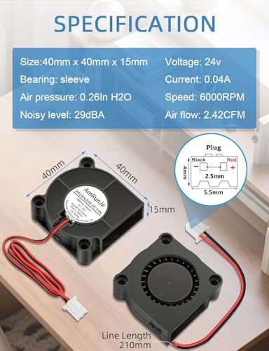 - SPECIFICATION: 40 x 40 x 15 mm ( 1.57 x 1.57 x 0.59 in. ) | Rated Voltage: 24V | Rated Current: 0.04 Amp | Power: 1 Watt | Speed: 6000 RPM | Noise: 29 dBA | Airflow: 2.42 CFM | Static Pressure: 0.26 In H2O
