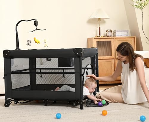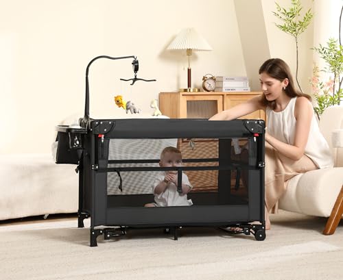 Pack and Play, 5 in 1 Baby Playard – Portable Crib, Bassinet, Bedside Sleeper, Changing Table & Playpen | Breathable Mesh | Safe & Foldable for Newborns to Toddlers (Black)
