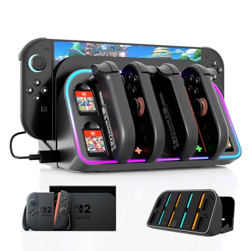- 【4 Magnetic Joy Con Charging ports】 Charge up to 4 Switch 2 Joy-Cons at once with the magnetic charging feature. Simply bring the controllers close and they’ll snap into place. Orange LED indicates charging, while Green LED shows a full or idle status