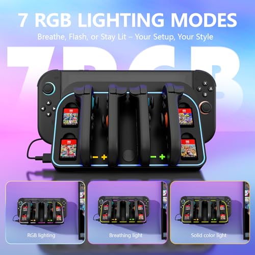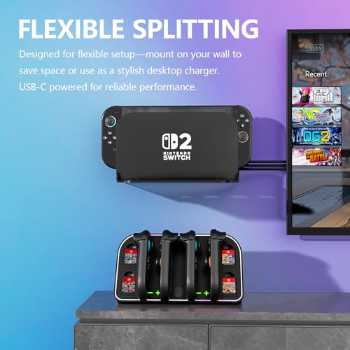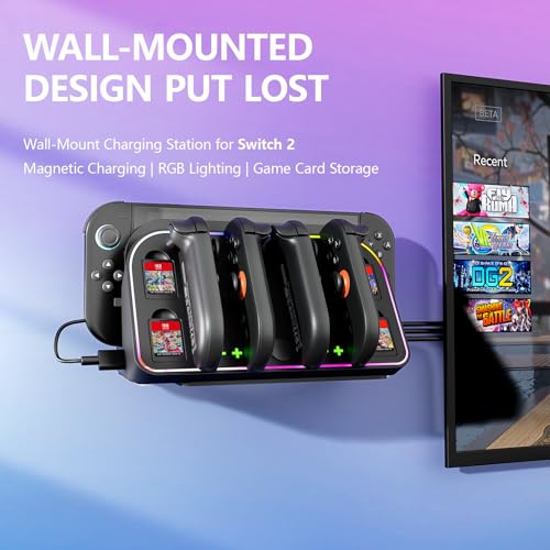 Wall Mount for Nintendo Switch 2 2025 - Switch Wall Mount with RGB Light & Joy Con Charger - 4 Joy Con Charging Ports, 7 RGB Modes Light, 4 Game Card Storage - Magnetic Charging with LED Indicators