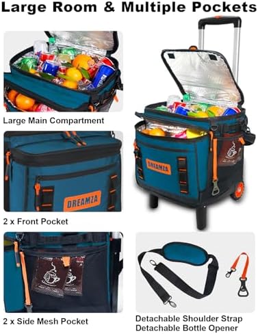 • ▶ 60-Can Large Capacity with Smart Storage - Spacious enough for all your essentials: holds up to 50 cans in the main compartment, plus 10 more in the insulated front pocket. Also includes a handy front pouch, two mesh side pockets, and a detachable bottle opener. Multiple Carrying Options - wheel it, hand-carry, or shoulder-carry, designed for total convenience!