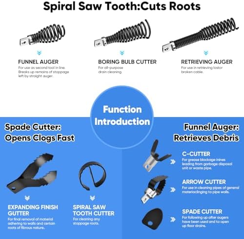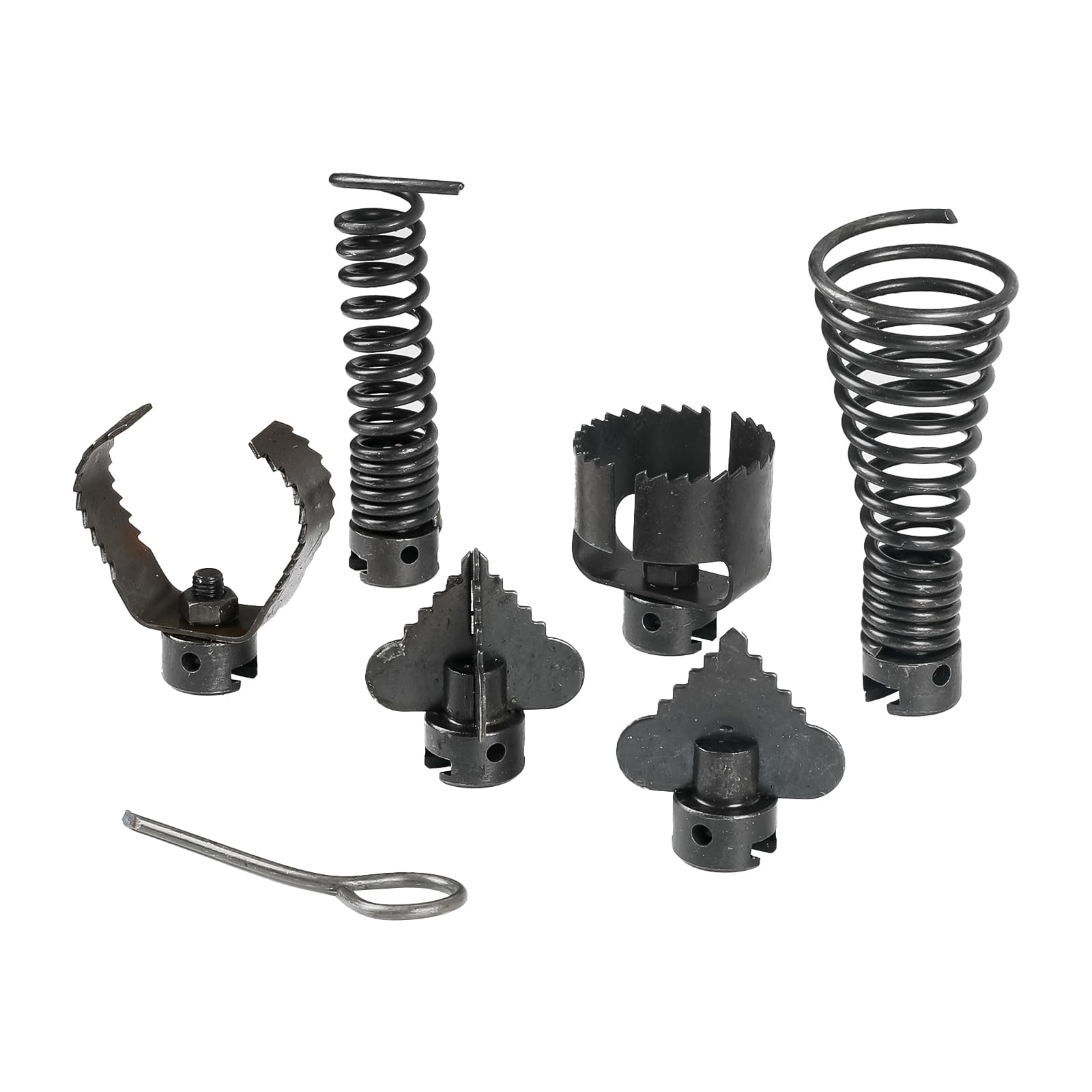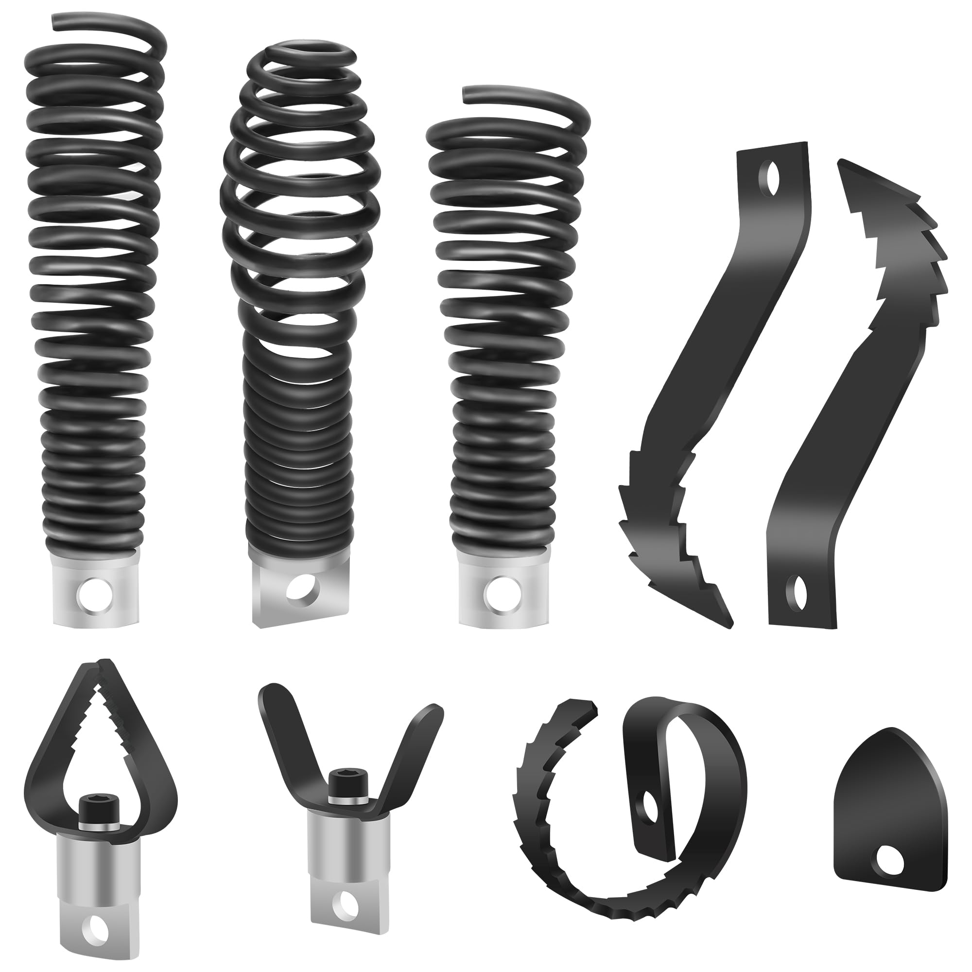- Versatile Clog-Clearing Efficiency: Our 9-piece multi-functional cutter head kit features a variety of specialized heads designed to tackle different types of clogs. For example, the "Spade Cutter" is ideal for initiating drain flow, while the "Spiral Saw Tooth Cutter" is specifically crafted for cutting through and removing tough blockages, like tree roots.
