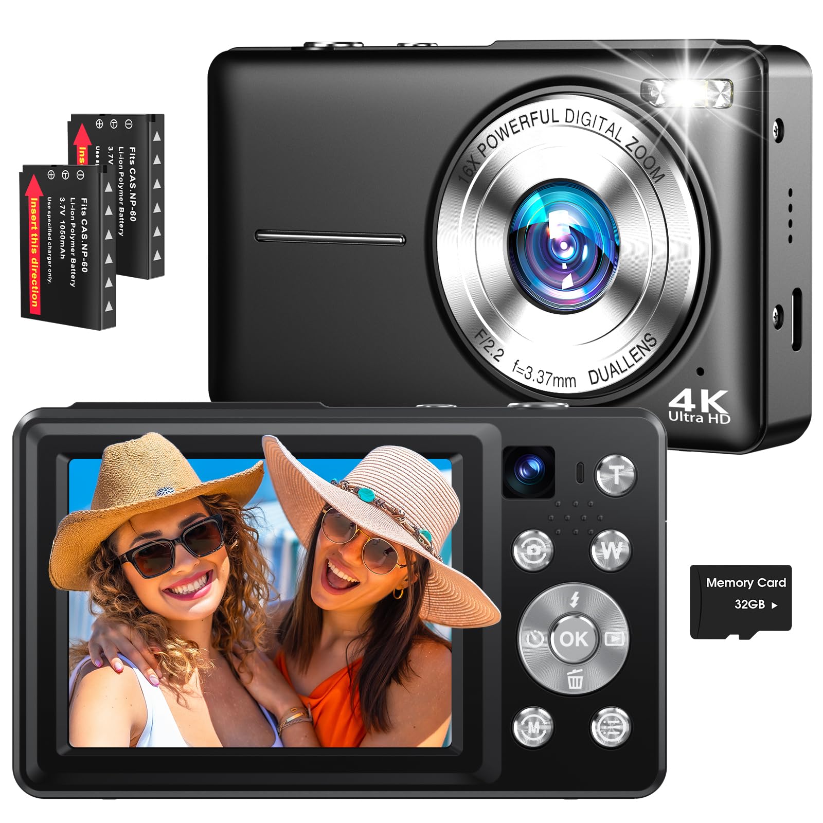 Dual Screen 5K Digital Camera for Vlogging with Fill Light - 80MP, 16X Zoom, WiFi, YouTube/Blogging, Includes 32GB Card & 2 Batteries (X9-Black)
