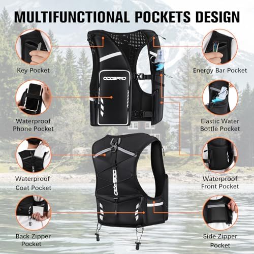 - 【Unique Design Running Vest】Worry about the phone and hiking poles storage while hiking? Enjoy the view on the way, ODDSPRO will solve this for you. Our running water vest is designed with a waterproof zipper phone holder pocket and hiking poles ties. The phone holder pocket is safe and easy to use. Zip and flip it down to different angles, you can face unlock your phone and message friends via the touchscreen. And freeing your hands by tying the hiking poles to the trekking pole straps!