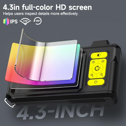 - 【4.3-Inch IPS Eye-Care Color Screen Endoscope Camera】Experience crystal-clear inspections with our advanced 4.3" IPS screen. Enjoy a massive 178° ultra-wide viewing angle for clear perspectives from any position and true-to-life 1:1 color reproduction. The integrated eye-care mode filters blue light, significantly reducing fatigue during prolonged use. The multi-directionally adjustable screen makes this inspection camera perfect for navigating tight engine compartments or intricate pipelines.