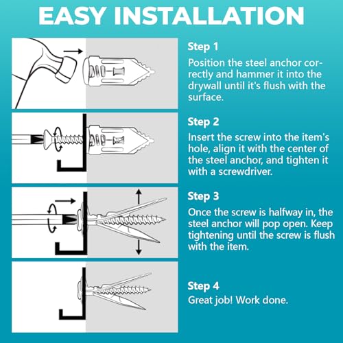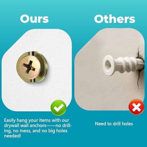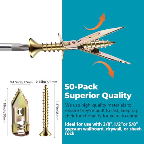 - Self-Drilling Anchor Screws: Each metal expansion screw kit supports up to 66 lbs of weight and is suitable for drywall thicknesses of 3/8 inch, 1/2 inch, and 5/8 inch. Ideal for hanging lightweight and medium-weight household items such as pictures, frames, wall lamps, curtains, plants, and cabinets.