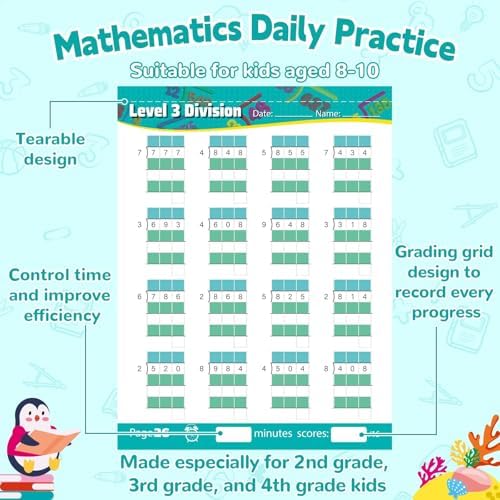 - Just 20 Minutes A Day: Tear one page down along the dotted line on each math worksheet’s top edge, and hand to children at a time. With our single, double & triple digit division math drills, a time and score tracking box at the bottom of each page allows parents and teachers to record progress, celebrate achievements, and keep kids motivated.