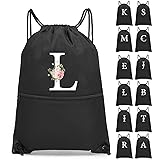 Drawstring Backpack, Personalized Initial Design Drawstring Bags Water Resistant String Bag for Women Men Gym Backpack Track Bag Sackpack Cinch Bags for Sports, Gym, Travel, Beach-Black (Letter L)