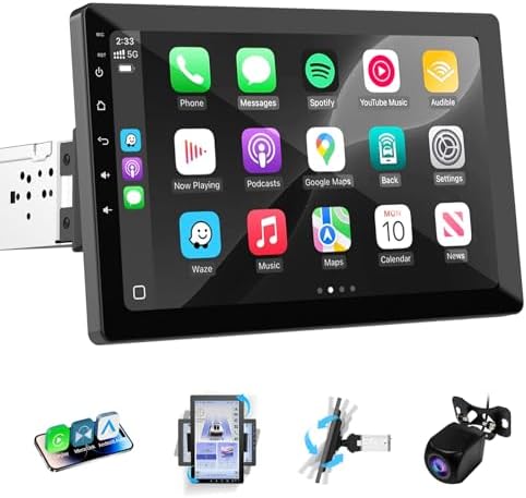 Single Din Car Stereo with Wireless Apple CarPlay & Android Auto, 10.1 Inch Rotatable Touch Screen Radio with Backup Camera, Mirror Link, GPS, Voice Control, Bluetooth, WiFi, AM/FM