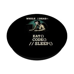 Shows the true life of a coder: powered by snacks, caffeine, and pure undead willpower. Perfect for anyone who's debugged more than they've slept. This skeleton dev is living that “while not dead” lifeideal for programmers, hackers, or tech geeks who love coding humor with a spooky twist. Adhesive backing attaches the PopGrip to your case or device. Will not stick to silicone, leather, waterproof, or highly textured cases. Works best with smooth, hard, plastic cases. Not compatible with wireless charging Printed top is swappable with other compatible PopGrip models. Just press flat, turn 90 degrees until you hear a click and remove to swap.