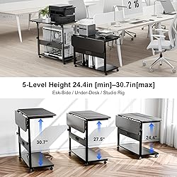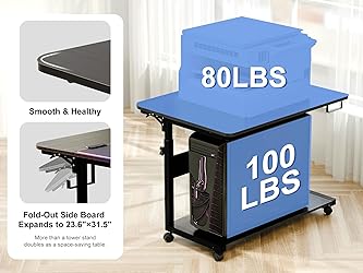 [Fit for PC Cases]: This height-adjustable PC tower stand offers a range from 24.4" to 30.7" with 5 gear settings, making it compatible with computer cases, including full-size ATX towers up to 27" in height. Whether you need to place your PC under the desk or next to your workstation, it provides flexible storage options and additional clearance that improves airflow for better heat dissipation. Please check your PC case dimensions carefully before purchasing to ensure the best fit. [Expanded Platform PC Stand]: The CPU holder not only features an large bottom dimension (13.8" × 30.7") to fit larger PC towers, gaming consoles, or multiple devices, but also includes a foldable side board that instantly extends your workspace up to 23.7" × 31.5" to hold office printers. Fold the board back when not in use to save space, or open it to create an additional workstation or side table whenever needed. [Mobility & Storage Combined]: This PC tower stand is equipped with four 360° mute wheels for smooth, quiet movement across floors and carpets, even under heavy load. Two lockable casters keep your computer securely in place for stable performance. Designed with convenience in mind, it also includes two sturdy hooks, perfect for storing headphones, controllers, or other accessories within easy reach, keeping your setup neat and organized. [PC Tower Stand with Power Strip]: Designed with three integrated 120V/12A outlets, this tower holder provides a simple and efficient way to power your computer, printer, desk lamp, or other electronic devices while keeping cables organized. Maintain a tidy, professional workspace with all your essentials conveniently charged. More than a stand, it also doubles as a functional side table, expanding your working area from the living room to the study as a reliable printer stand or sofa table. [Multi-Scenario Versatility]: This 2-tier computer tower stand fits seamlessly into any settin, whether it’s a home office, a busy workplace, a classroom, or a gaming room. More than just a computer tower holder, it doubles as a printer stand, mobile side table, or sofa table, offering additional workspace and storage when needed. With its modern design and practical functionality, it meets the diverse needs of IT professionals, office workers, and gamers alike. [Safety First]: For the best performance, please ensure all screws and parts are securely tightened after installation. While the stand is built with a sturdy frame and thickened panels, the load-bearing capacity may vary depending on height adjustment. If you plan to place a large computer tower or heavier equipment, we recommend using the lower height levels for maximum stability. Regularly check connections to keep your setup safe and secure.