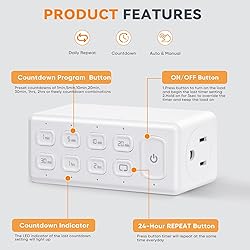CUSTOMIZABLE TIMER: Use 7 preset Countdown Time buttons (1min, 5min, 10min, 20min, 30min, 1hour and 2hour) to set countdown times, plus an ON/OFF override button to turn your device on or off instantaneously EASY PROGRAM: Electrical outlet timer via combining multiple time buttons, create a variety of countdown times(up to 4 hours), effortlessly adapts to your unique needs. Such as, press 1hr + 30mins button to set 1.5-hours REPEAT FUNCTION: Digital timer outlet lets you program repeat schedules for curling irons, coffee makers, slow cookers, and more. No daily resetting needed—it repeats automatically at the same time every day (Does not cycle multiple times per day) SAVING ENERGY: Prevent wasted electricity and lower your bills! These electric timer outlets automatically devices on/off based on your schedule—reducing energy waste, cutting costs, and protecting appliances. Perfect for homes, offices, dorms SAFE & RELIABLE: The auto shut off timer outlet plug supports 1/2HP and rated at 15A/125V/1875W which suitable for many home appliances. Perfect for lights, fans, coffee makers, heaters, and slow cookers; Fit for both GFCI and standard receptacles