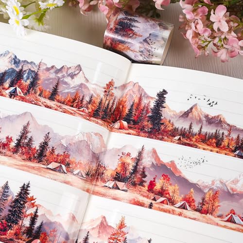 • Stunning Autumn Mountain Scenery Design: This PET tape features a breathtaking autumn scene with vibrant colors, majestic mountains, and serene camping settings, offering a picturesque backdrop for your creative projects