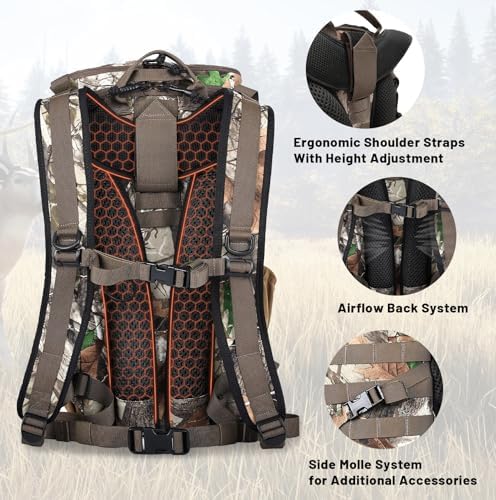 - 【Thoughtful Design for All Conditions】Weatherproof your adventures with the built-in rain cover, ensuring your gear stays dry in unexpected downpours. Stay hydrated on the move with the hydration bladder port, without having to stop. Perfect for day pack hunting and all-weather preparedness.