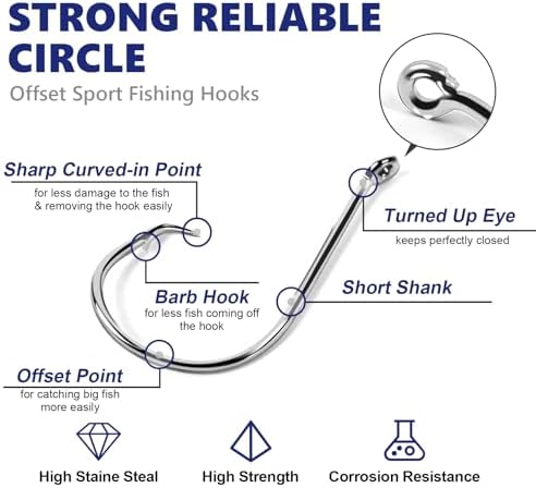 - 【Good Craftsmanship】The eye of circle hook is clearly precision bent into a perfectly closed round smooth circle, while the shaft gently curves into the correct bends and shapes to make hooking a fish an effortless task and the barb is masterfully designed
