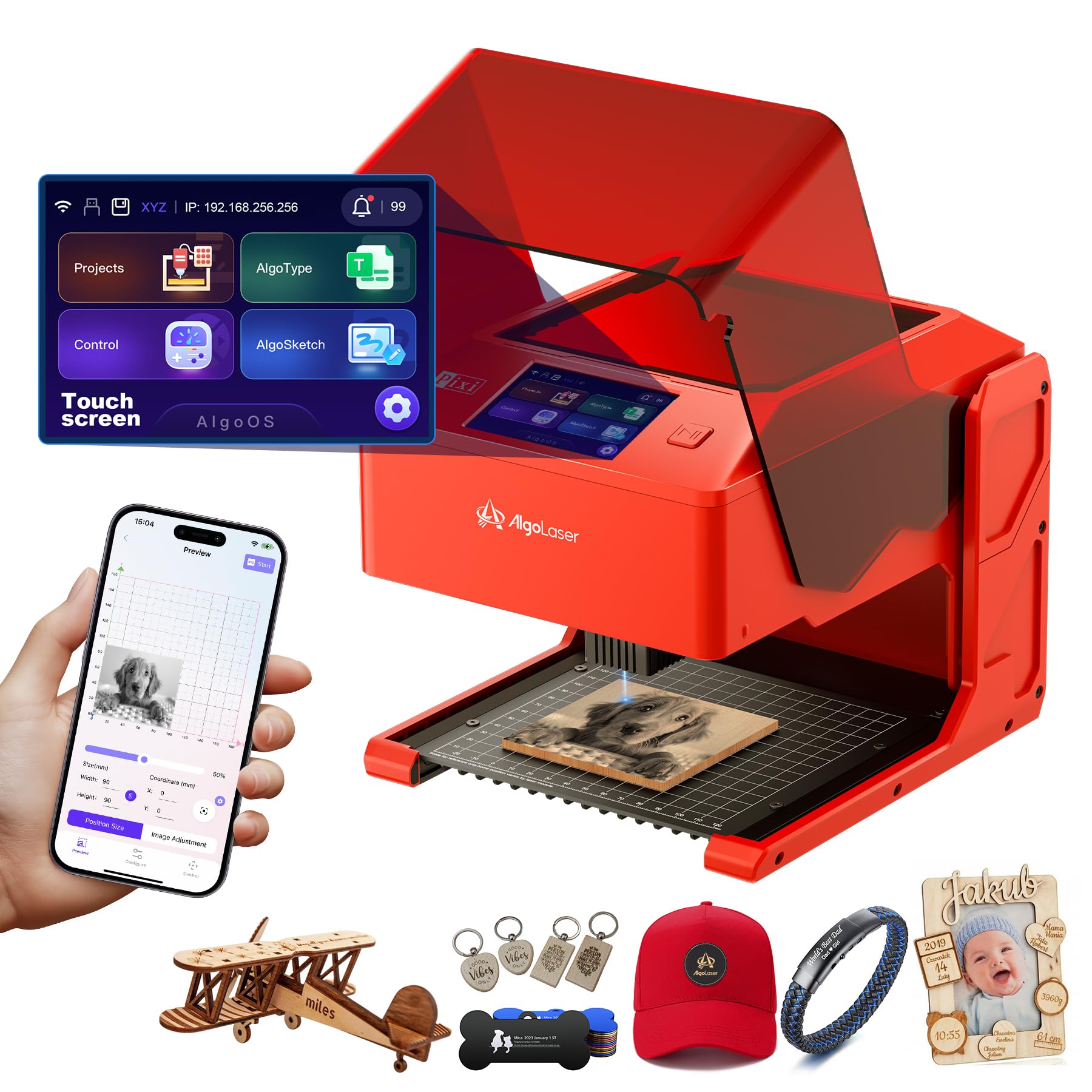 - All-in-One Smart Touchscreen Control Featuring a built-in 3.5" Smart Touchscreen and the exclusive AlgoOS system, the Alpha MK2 laser engraving machine eliminates the need for complex software setups—just power it on and start engraving. Handle wood, metal, acrylic, leather, and glass with precision using the powerful 20,000mW laser module. A semi-enclosed design and smart air pump provide cleaner, dust-free results, making it ideal for laser engravers, hobbyists, or professionals