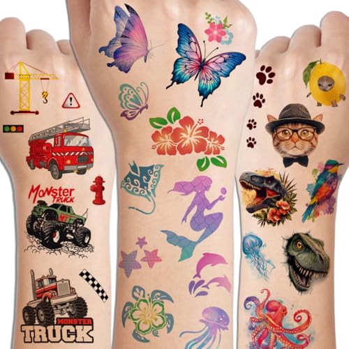- ⚡Set Includes 320 Mixed Styles Tattoo Stickers for Kids Party Supplies -- Super adorable and fun temporary tattoos. This tattoo sticker set contains many elements(car and truck, dinosaurs, watercolor animals, butterfly, flower,monster truck,dog,cat,mermaid, hawaii) that kids will like. Add an individual extra touch of fun to a children’s birthday party or event with CHARLENT tattoo stickers.