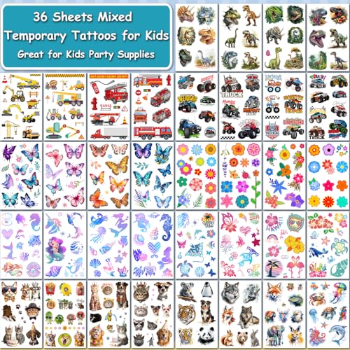 Temporary Tattoos for Kids - 320 Mixed Styles (36 Sheets) Tattoo Stickers Set for Boys and Girls, Car Dinosaur Hawaii Mermaid Watercolor Animals Tattoos for Kids Birthday Party Supplies