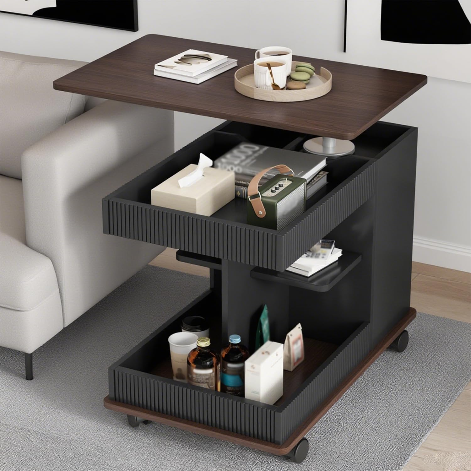 - 【Space saving & uniquess design】This living room end table, which uses a uniquess mathematical exterior design, the left is "5", the right is "2", showing a visually interesting effect. Side table with 360-degree universally pulleys, aluminum silent wheels with brakes fixed for easy movement.And its design is designed to maximize storage while also minimizing footprint, making it an excellent choice for small Spaces, living rooms, apartments, bedrooms.