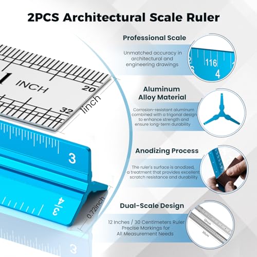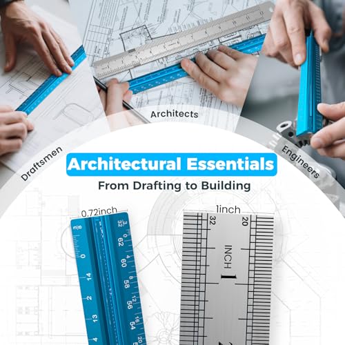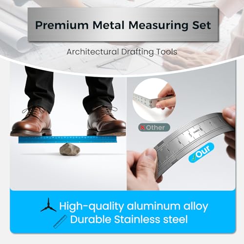 - Professional Metal Scale Ruler Set: You can get a triangular ruler in high-quality aluminum alloy for 1:16 architectural scale—lightweight, impact-resistant, and durable. Also, the set includes a stainless steel ruler for 1:1 scale measurement—flexible, durable, and wear-resistant