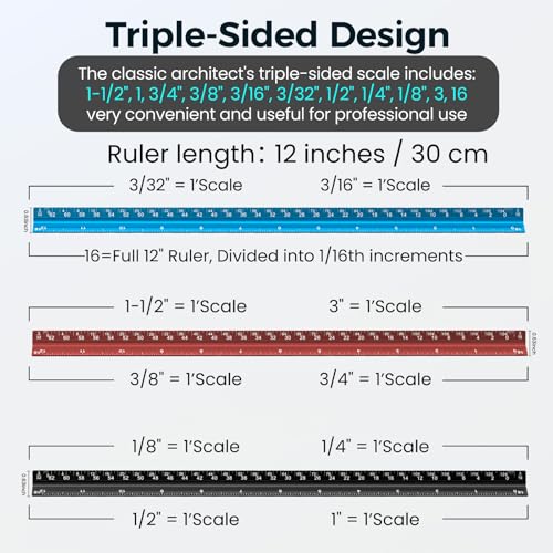 - Laser-Etched Markings: Featuring fade-proof, laser-etched imperial engineer scale (1-1/2", 1", 3/4", 3/8", 3/16", 3/32", 1/2", 1/4", 1/8", 3", 16") for unmatched accuracy in architectural and engineering scale drawings